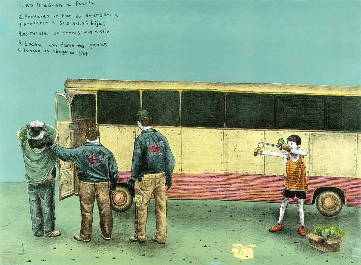 Juana Estrada Hernandez, 'Nopalaso en nombre de nuestras familias!', (2020). A drawing of two police officers and a third person standing next to a bus while a child wearing a striped shirt.
