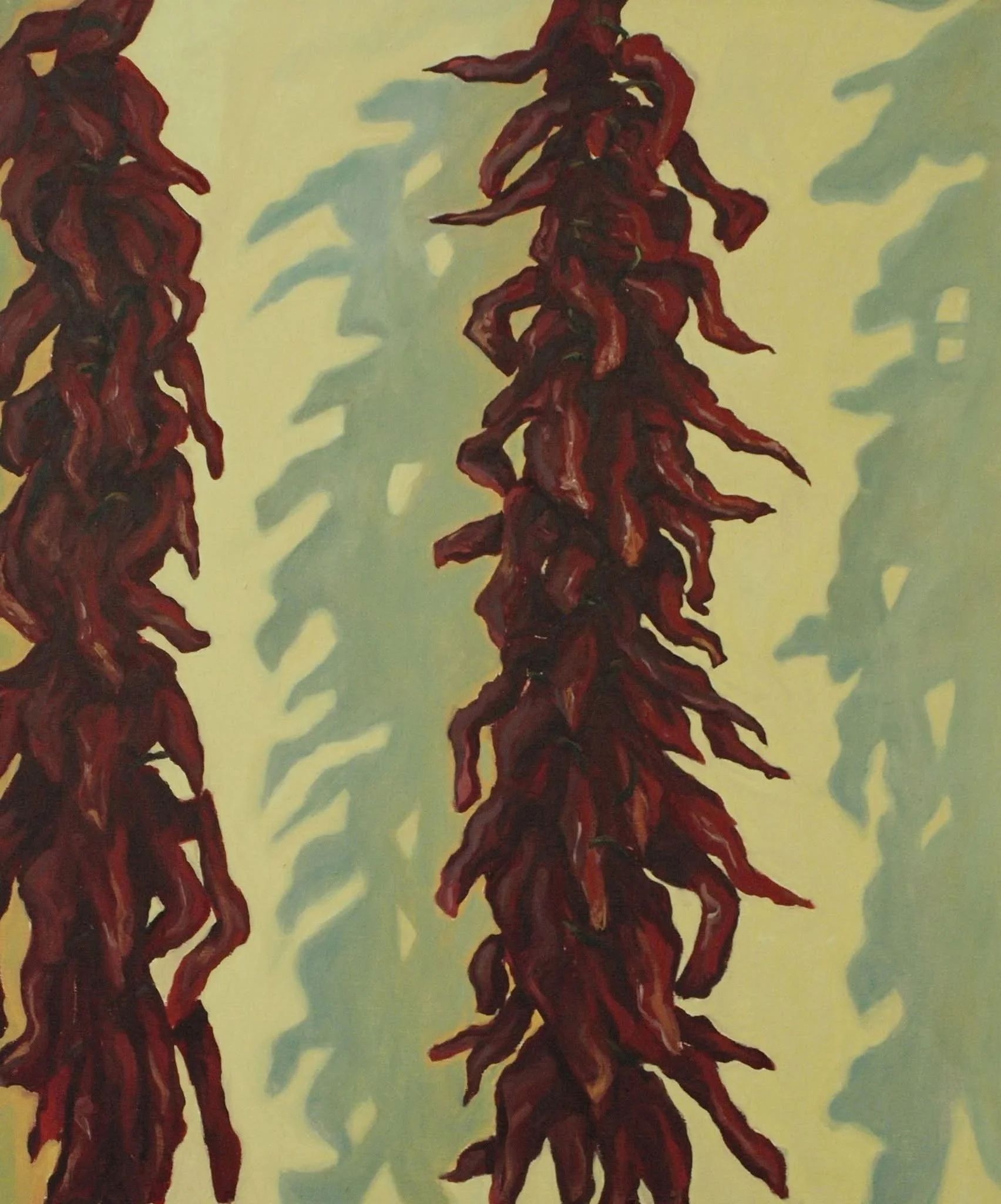 Close-up painting of dried red chili peppers hanging in clusters, casting shadows on a yellow background.