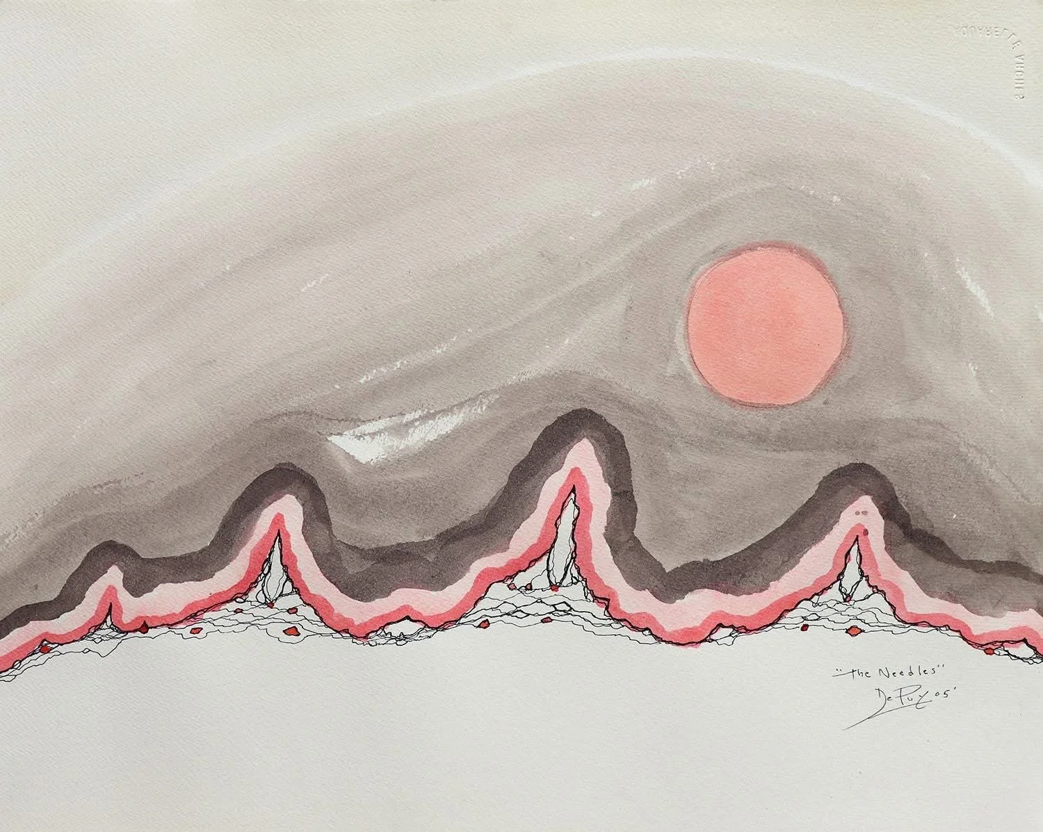 John De Puy, 'The Needles' (2005), watercolor painting on paper with gray and black mountain-like shapes, pink highlights, a large pink sun in the sky, and black ink line details at the base.